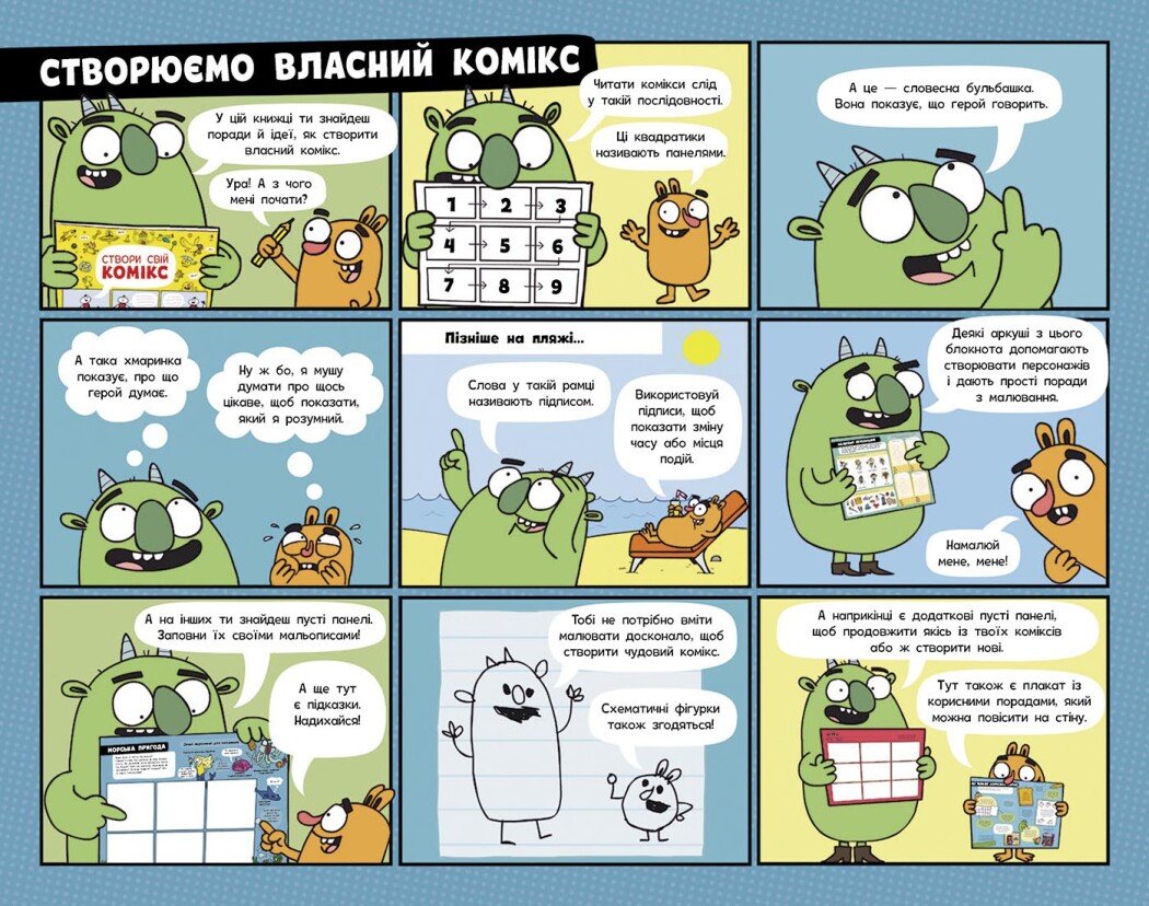 Книжка ‘Створи свій комікс’ – найкращий тренажер для розвитку творчої уяви майбутнього мальописця. Дитина може створювати комікси про пригоди монстрів, подвиги супергероїв та повстання роботів. У книжці зібрано поради щодо малювання персонажів, їхніх дій та емоцій.